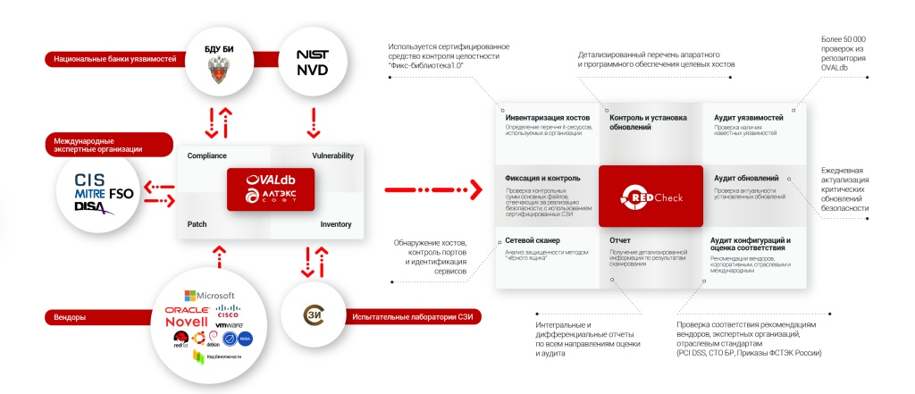 Помимо сетевых и системных проверок на уязвимости, его функциональные возможности усилены средствами контроля соответствия, механизмами оценки защищенности СУБД и систем виртуализации, средствами патч-менеджмента, контроля целостности и рядом других не менее важных функций. RedCheck создает "моментальный снимок" состояния безопасности системы, позволяет обнаруживать ошибки администраторов и выполнять аудит системы для оценки соответствия политикам и стандартам безопасности.